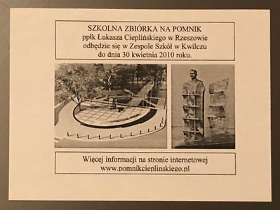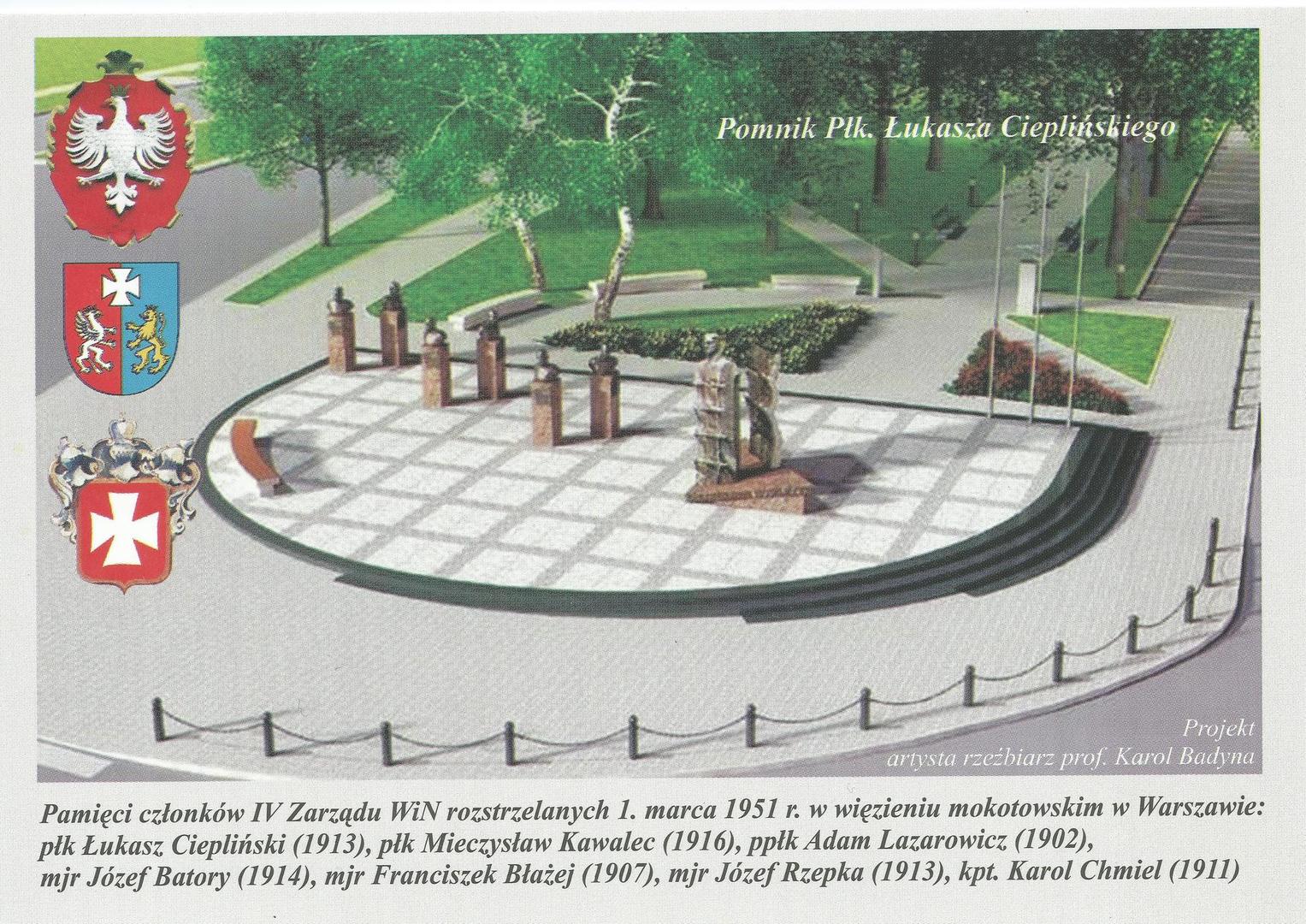 Wyjątkowym sposobem upamiętnienia Cieplińskiego i oddania czci rozstrzelanym członkom IV ZG WiN oraz wszystkim Żołnierzom Wyklętym jest okazały pomnik, odsłonięty 17 listopada 2013 r. w centrum Rzeszowa, przy zbiegu Alei Cieplińskiego oraz ulic: Moniuszki i Zygmuntowskiej. Uroczystości rozpoczęły się od mszy koncelebrowanej przez bp. Jana Wątrobę w Bazylice Wniebowzięcia NMP OO. Bernardynów. Autorem pomnika jest artysta-rzeźbiarz prof. Karol Badyna, a odsłonięcia dokonali: ks. infułat Józef Sondej – były kapelan AK, a jednocześnie kolega z ławy szkolnej dwóch członków IV ZG WiN oraz przedstawiciele ich rodzin. Wśród fundatorów pomnika znaleźli się również przedstawiciele Ziemi Kwileckiej tj. Zarząd Gminny PSL i koło historyczne działające w szkole. Podczas rzeszowskich uroczystości gminę Kwilcz reprezentowała delegacja w składzie: wiceprzewodniczący Rady Gminy – Zdzisław Lehmann z małżonką Olgą i dyrektor Zespołu Szkół – Agata Tomkowiak z mężem Wiesławem. Na zakończenie w Filharmonii Podkarpackiej odbył się koncert w hołdzie Żołnierzom Wyklętym, podczas którego wystąpiło ponad 130 wykonawców. Z okazji odsłonięcia pomnika wydano również pamiątkową publikację pt. „W hołdzie Pułkownikowi Łukaszowi Cieplińskiemu, Członkom IV Zarządu Głównego Zrzeszenia Wolność i Niezawisłość, Żołnierzom Wyklętym”, w której przypomniano życiorysy bohaterów oraz w formie kalendarium przedstawiono działania Społecznego Komitetu Budowy Pomnika, a także spis instytucji i ofiarodawców prywatnych.