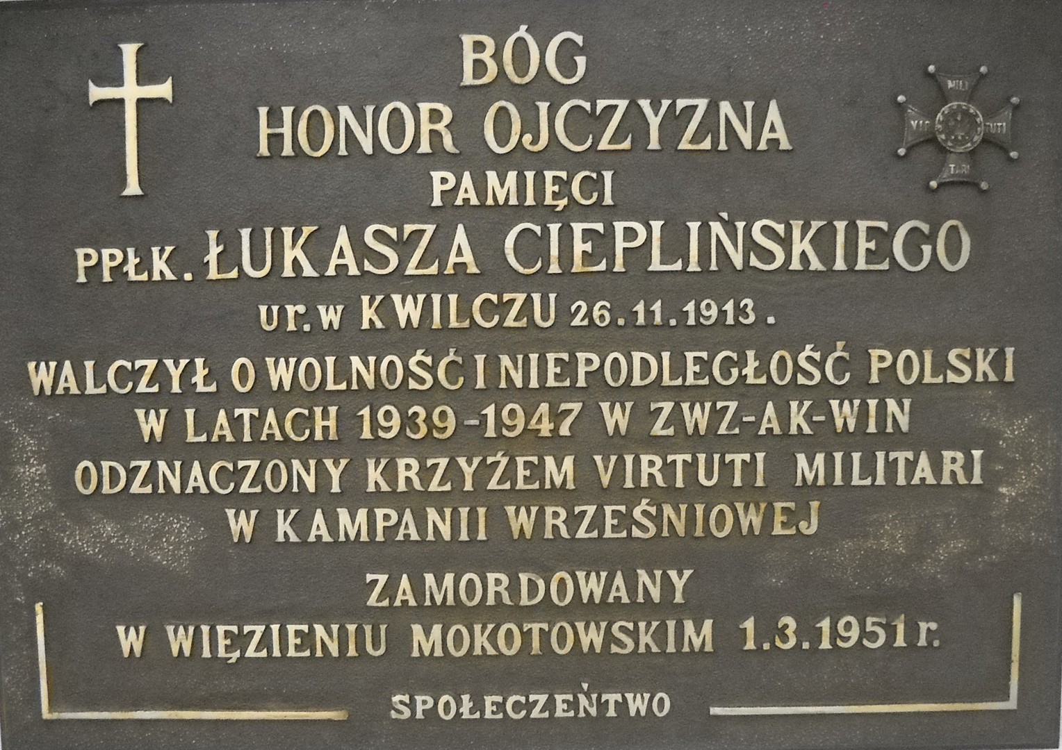 Także w rodzinnej miejscowości Cieplińskiego pamięć o nim jest kultywowana. W 100. rocznicę urodzin słynnego Kwilczanina, w miejscowym kościele parafialnym, mszę w jego intencji odprawił proboszcz ks. Jan Kasztelan. Obecni byli przedstawiciele rodziny mieszkający w Kwilczu tj. siostrzenica Wiesława Styperek i siostrzeniec Roman Fechner z małżonką Marią, a także władze samorządowe, dyrektorzy placówek oświatowych, delegacje organizacji kombatanckich i partii politycznych, poczty sztandarowe, nauczyciele i młodzież szkolna oraz mieszkańcy gminy. Po mszy złożono wiązanki kwiatów pod tablicą pamiątkową, gdzie głos zabrała zastępca wójta Anna Nowicka. Natomiast co roku 1 marca w Narodowym Dniu Pamięci Żołnierzy Wyklętych (ustanowionym od daty śmierci płk. Łukasza Cieplińskiego i jego współpracowników: ppłk. Adama Lazarowicza, płk. Mieczysława Kawalca, mjr. Józefa Batorego, mjr. Franciszka Błażeja, mjr. Józefa Rzepki i kpt. Karola Chmiela) odbywają się w Kwilczu wzruszające uroczystości, przygotowywane przez gimnazjalistów, w szkole i przy tablicy pamiątkowej umieszczonej w 1991 r. we wnęce muru okalającego dziedziniec kościoła parafialnego, kilkadziesiąt metrów od rodzinnego domu, w którym Łukasz przyszedł na świat.