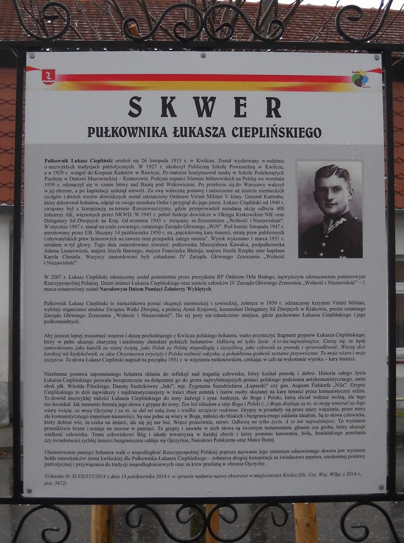 W wyniku realizacji gminnego projektu „Historyczny zakątek. Rewitalizacja miejscowości poprzez nadanie nowego oblicza miejscu pełniącemu funkcje społeczno-kulturalne w Kwilczu”, czyli odnowieniu południowej pierzei dawnego kwileckiego rynku, Monika Pestka-Lehmann wpadła na pomysł nazwania powstałego w ten sposób skweru, imieniem Cieplińskiego. Projekt złożony za pośrednictwem Lokalnej Grupy Rybackiej Obra-Warta, otrzymał dofinansowanie w ramach Programu Operacyjnego „Zrównoważony rozwój sektora rybołówstwa i nadbrzeżnych obszarów rybackich 2007-2013”. Przedmiotem projektu była rewitalizacja terenu znajdującego się w centrum miejscowości Kwilcz, biegnącego wzdłuż ulicy Kardynała Stefana Wyszyńskiego. Rewitalizacja placu miała na celu zachowanie i wyeksponowanie walorów tego miejsca, mającego stać się wizytówką najstarszej części miejscowości. Formalnie z inicjatywą wprowadzenia nazwy „Plac im. płk. Łukasza Cieplińskiego”, wystąpili kwileccy chórzyści na czele z organistą Marianem Góreckim i Waldemarem Rymarskim.