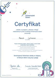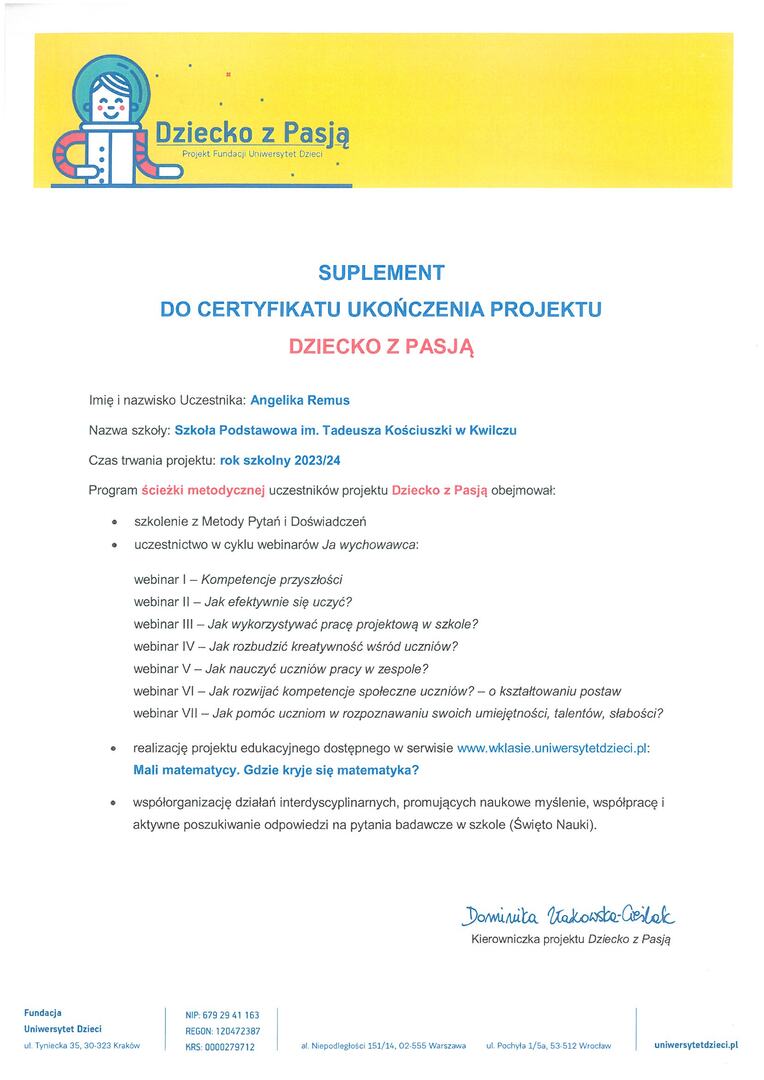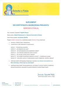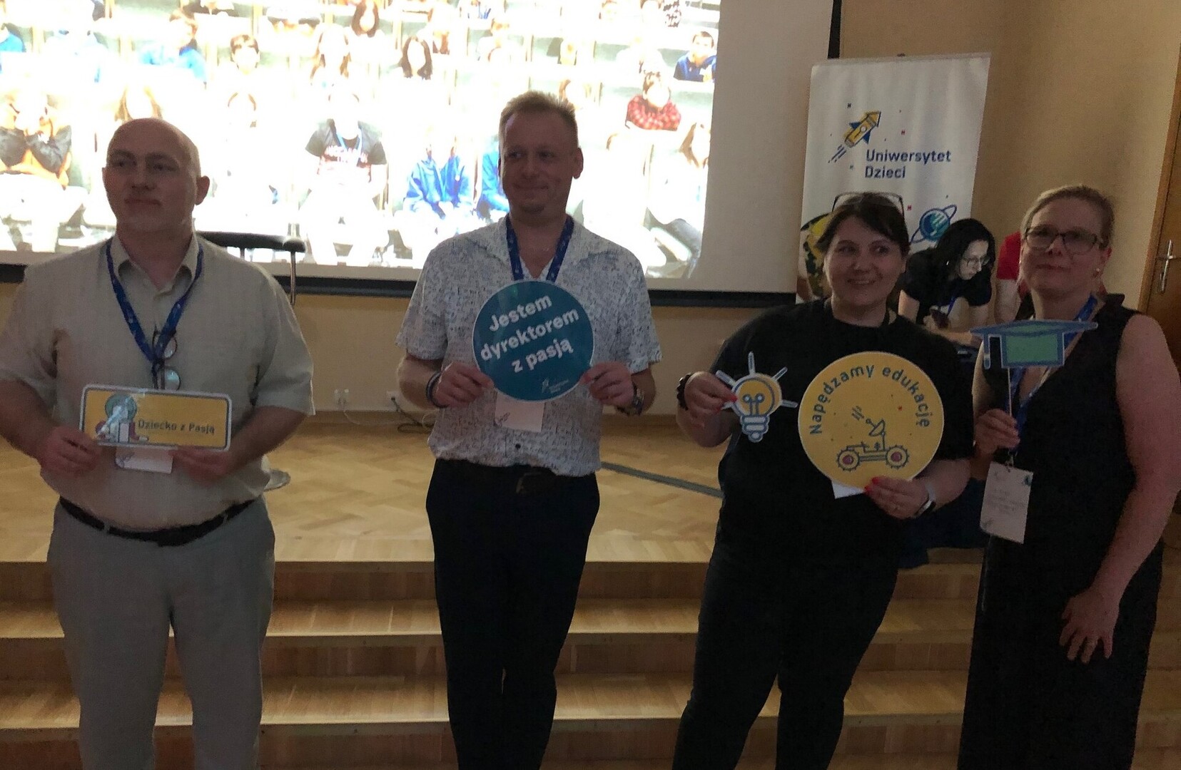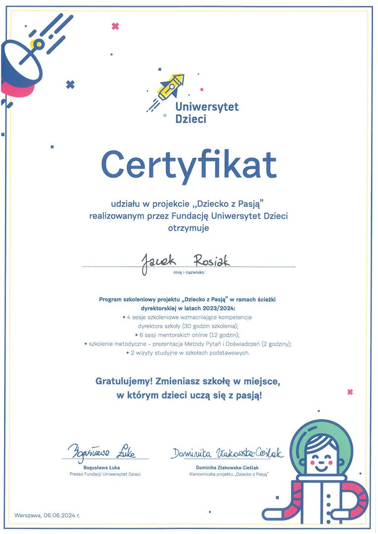 W Warszawie 5 i 6 czerwca 2024 r. odbyła się ostatnia sesja projektu "Dziecko z Pasją", który był realizowany w naszej placówce w kończącym się roku szkolnym. Dyrektorzy i wicedyrektorzy z 60 szkół podstawowych z całej Polski spotkali się, aby podsumować dwie pierwsze edycje projektu krakowskiej Fundacji Uniwersytet Dzieci. Przedstawiciele wielkopolskich szkół z gniazda zachodniego, którym opiekowały się mentorki z Gdańska – Krystyna Baryś i Justyna Dmitruk, odśpiewali hymn projektu, przygotowany przez dyr. Jacka Rosiaka, zobaczyli premierową prezentację filmu podsumowującego projekt i omówili propozycje dalszej współpracy. Realizację projektu w naszej szkole koordynowała kol. Angelika Remus.