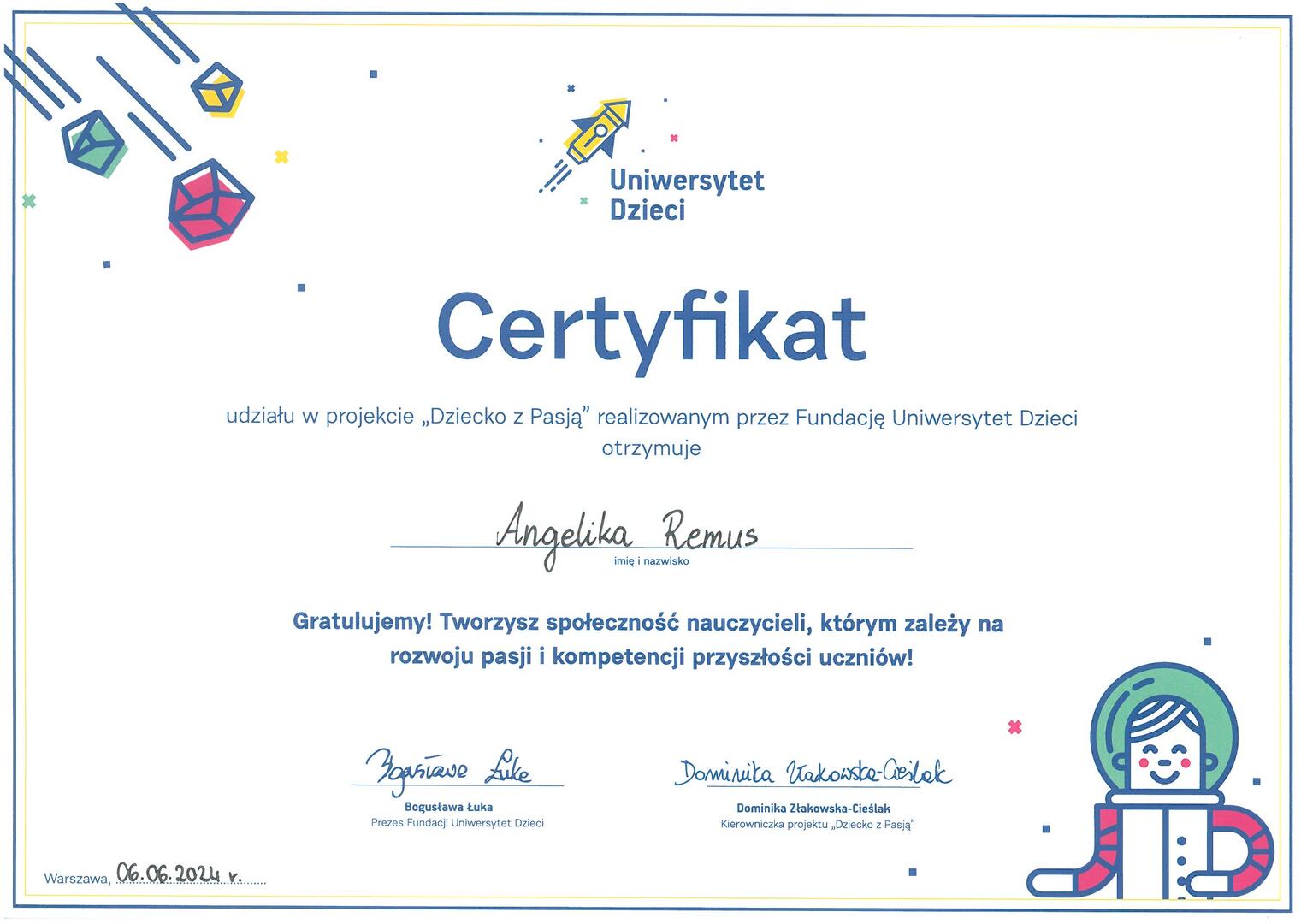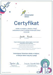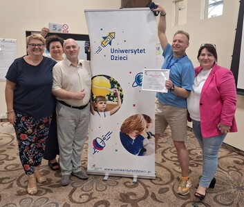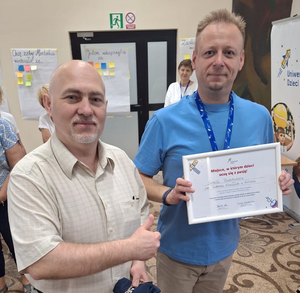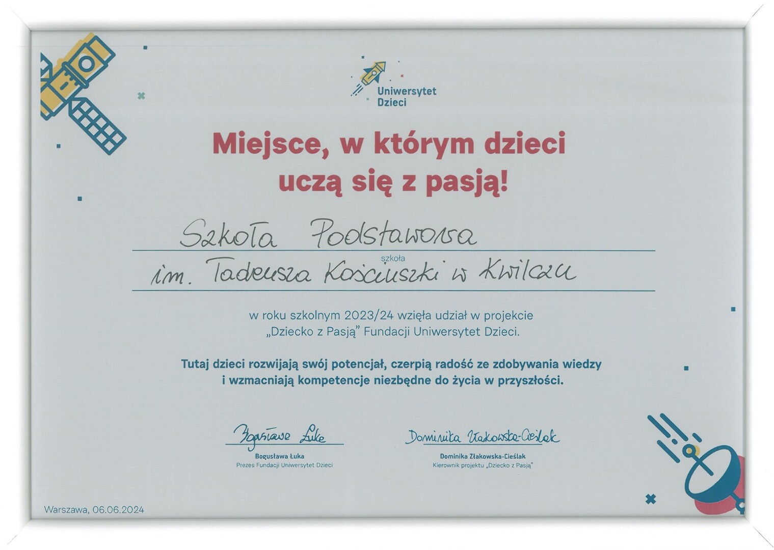 W Warszawie 5 i 6 czerwca 2024 r. odbyła się ostatnia sesja projektu "Dziecko z Pasją", który był realizowany w naszej placówce w kończącym się roku szkolnym. Dyrektorzy i wicedyrektorzy z 60 szkół podstawowych z całej Polski spotkali się, aby podsumować dwie pierwsze edycje projektu krakowskiej Fundacji Uniwersytet Dzieci. Przedstawiciele wielkopolskich szkół z gniazda zachodniego, którym opiekowały się mentorki z Gdańska – Krystyna Baryś i Justyna Dmitruk, odśpiewali hymn projektu, przygotowany przez dyr. Jacka Rosiaka, zobaczyli premierową prezentację filmu podsumowującego projekt i omówili propozycje dalszej współpracy. Realizację projektu w naszej szkole koordynowała kol. Angelika Remus.
