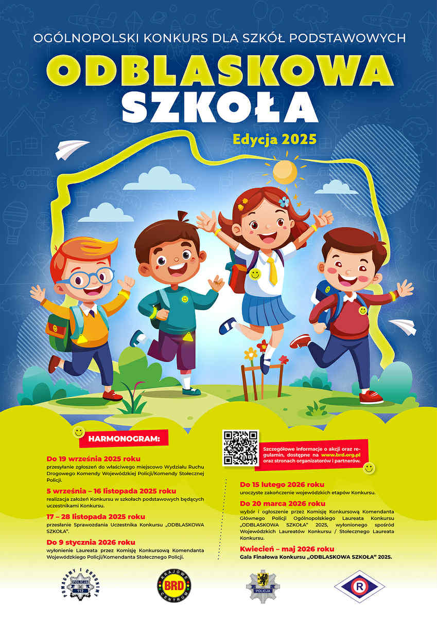 Nasza szkoła bierze udział w konkursie ,,ODBLASKOWA SZKOŁA 2025” Bezpieczeństwo dzieci na drogach to wspólna odpowiedzialność – rodziców, nauczycieli i całej społeczności lokalnej. Jednym z najważniejszych elementów troski o najmłodszych uczestników ruchu jest edukacja oraz promocja noszenia elementów odblaskowych. Właśnie temu służy konkurs „Odblaskowa Szkoła”, którego ogólnopolska edycja rozpoczyna się już w roku szkolnym 2025/2026. W trosce o bezpieczeństwo najmłodszych uczestników ruchu drogowego, Komenda Wojewódzka Policji w Poznaniu realizuje edycję ogólnopolskiego konkursu „Odblaskowa Szkoła” 2025. Celem konkursu jest przede wszystkim uświadamianie dzieciom i młodzieży, jak ważna jest widoczność na drodze. Elementy odblaskowe mogą uratować życie – zwłaszcza w okresie jesienno-zimowym, gdy szybciej zapada zmrok. Celem konkursu jest również: - promowanie noszenia elementów odblaskowych, - wyposażenie jak największej liczby uczestników ruchu drogowego w odblaski, - zachęcanie do bezpiecznych, partnerskich zachowań na drodze, - popularyzowanie przepisów ruchu drogowego. - zwiększenie świadomości dzieci, rodziców oraz społeczności lokalnej w zakresie bezpieczeństwa w ruchu drogowym, Udział w konkursie to doskonała okazja, by szkoły wraz z samorządami, rodzicami i opiekunami zadbały o bezpieczeństwo uczniów – szczególnie podczas drogi do i ze szkoły.
