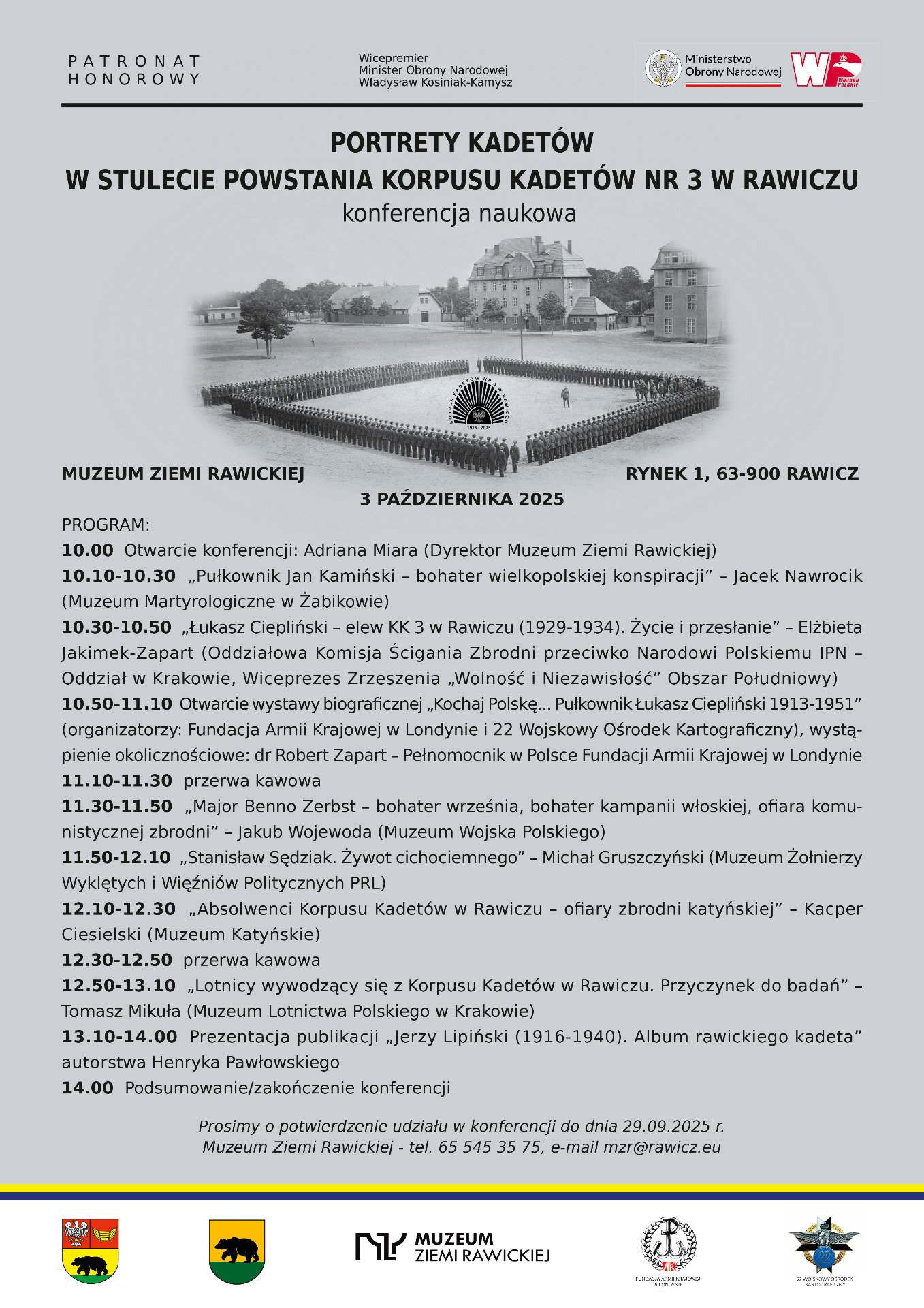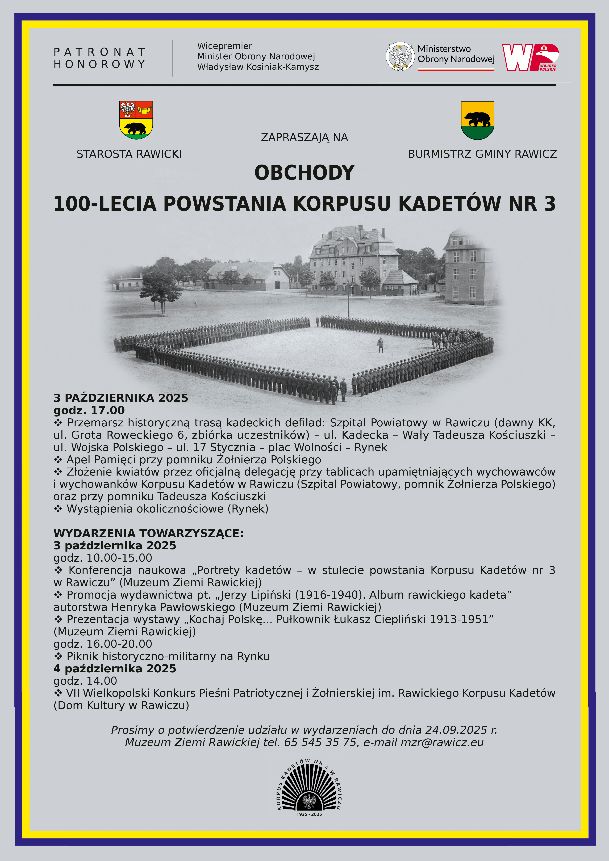W piątek 3 października 2025 r., pod honorowym patronatem wicepremiera i ministra obrony narodowej Władysława Kosiniaka-Kamysza, odbyły się w Rawiczu obchody 100 rocznicy powstania Korpusu Kadetów nr 3, którego tradycje kultywuje miejscowy Zespół Szkół nr 3 im. Rawickiego Korpusu Kadetów. W Muzeum Ziemi Rawickiej o godz. 10:00 rozpoczęła się konferencja naukowa pt. „Portrety kadetów – w stulecie powstania Korpusu Kadetów”, podczas której zaprezentowano wystawę, autorstwa Elżbiety Jakimek-Zapart, pt. "Kochaj Polskę... Pułkownik Łukasz Ciepliński 1913-1951". Na ekspozycji można było również zobaczyć jeden z oryginalnych grypsów Łukasza i Order Orała Białego, które z Poznania przywiozła Marta Kuińska. Podczas konferencji odbyła się też promocja wydawnictwa "Jerzy Lipiński (1916-1940). Album rawickiego kadeta", autorstwa Henryka Pawłowskiego. Publikacja powstała dzięki zachowanym zdjęciom kadeta Lipińskiego, które przekazał Muzeum Ziemi Rawickiej mec. Jacek Taylor, notabene potomek dawnych właścicieli Prusimia. O godz. 17.00 uczestnicy obchodów przemaszerowali historyczną trasą kadeckich defilad, która rozpoczęła się przy budynku dawnej siedziby Korpusu Kadetów (obecnie miejscowego szpitala), od złożenia wiązanek kwiatów pod tablicami pamiątkowymi. W imieniu SP Kwilcz wiązankę kwiatów złożyli Monika i Marcin Lehmann. Uczniów z klas mundurowych oraz żołnierzy i poczty sztandarowe prowadziła Orkiestra Dęta Miejska Górka. Apel Pamięci odbył się przy pomniku Żołnierza Polskiego, a na rynku miały miejsce wystąpienia okolicznościowe władz samorządowych i zaproszonych gości. Kwiaty składano też przy pomniku Żołnierza Polskiego i pomniku Tadeusza Kościuszki. Wydarzenie zostało zorganizowane przez starostę rawickiego i burmistrza gminy Rawicz. Na rynku urządzono piknik historyczno-militarny. Przygotowano szereg atrakcji związanych ze służbami mundurowymi i historią wojskowości: stoiska promocyjne formacji wojskowych, służb mundurowych oraz szkół o profilach mundurowych, zwiedzanie wystawy tematycznej i ekspozycji w Sali Kadeckiej Muzeum Ziemi Rawickiej, kiermasz książek historycznych i asortymentu survivalowego.