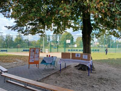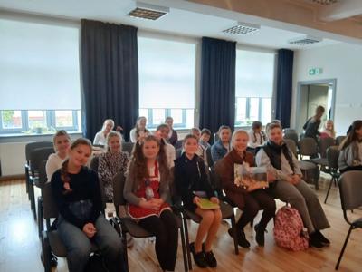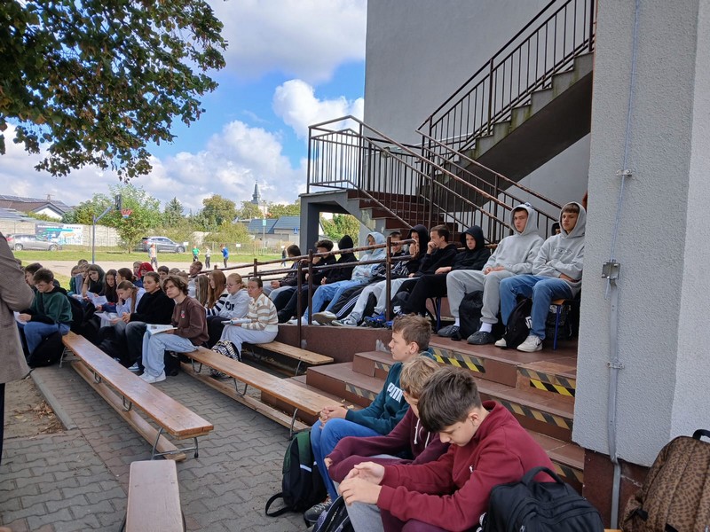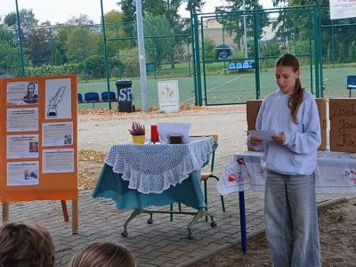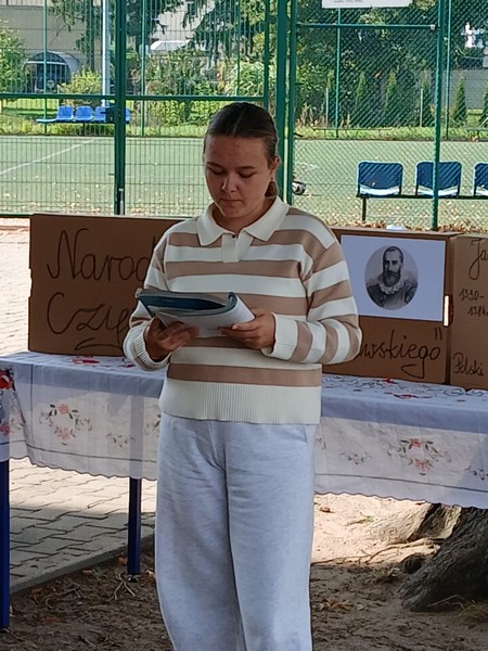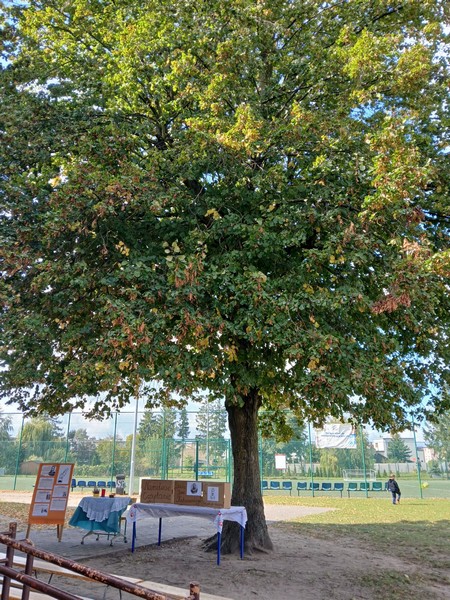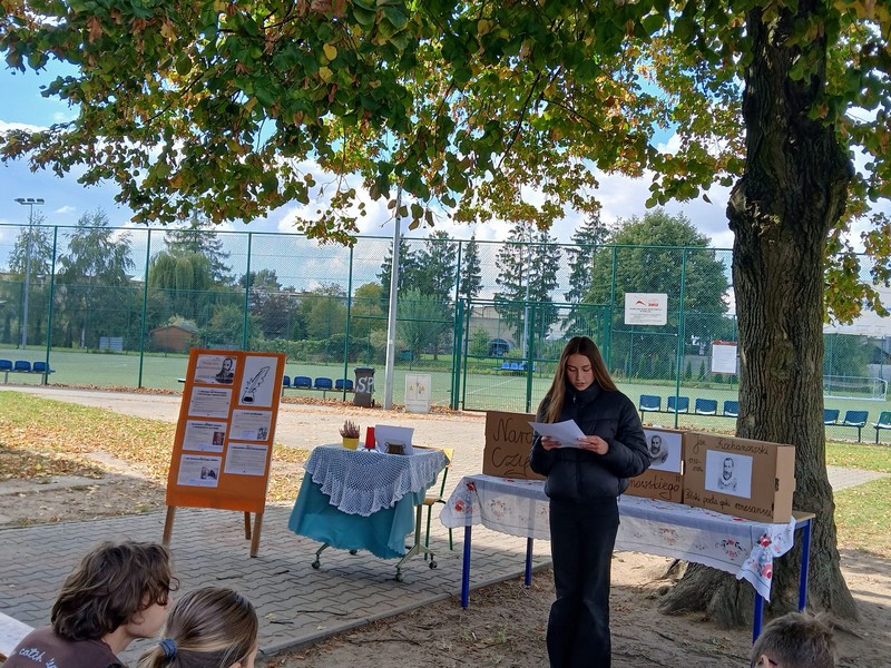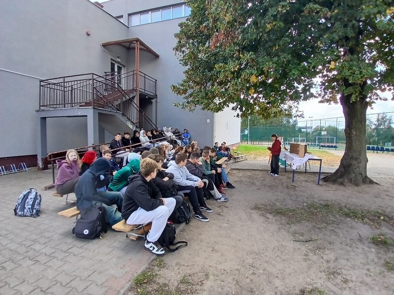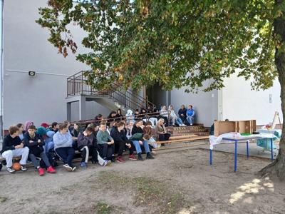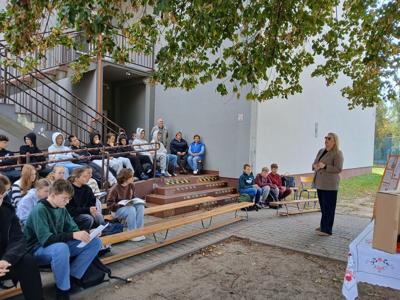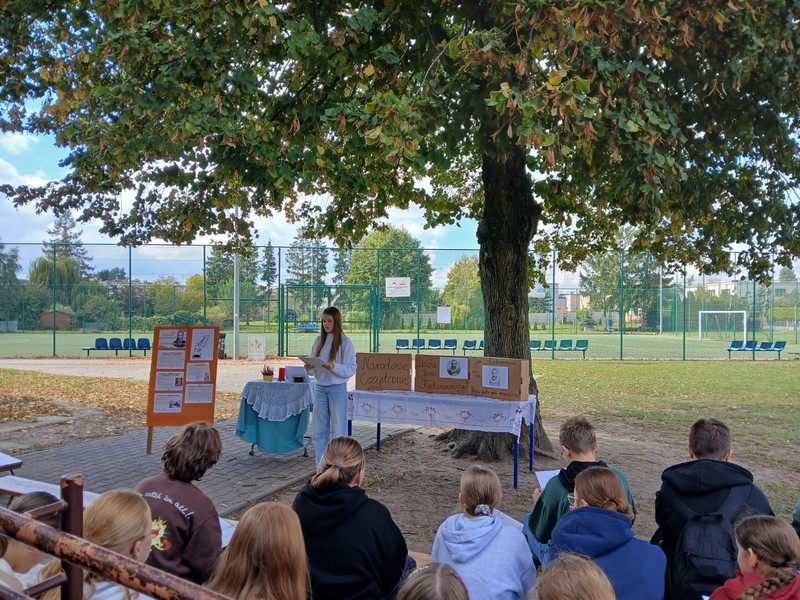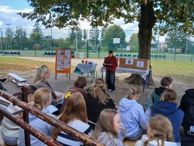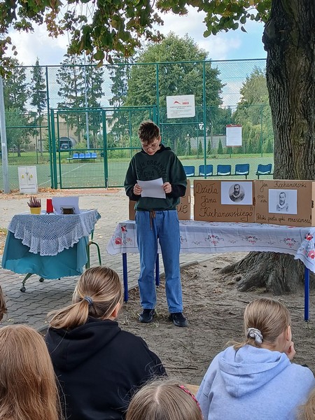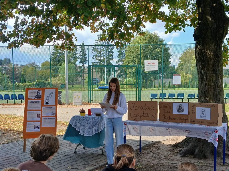 Uczniowie klas ósmych spotkali się pod lipą, obok szkoły, gdzie klasa 8c przeczytała dzieła Jana Kochanowskiego.