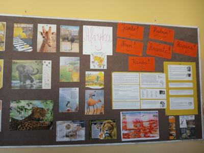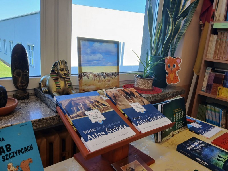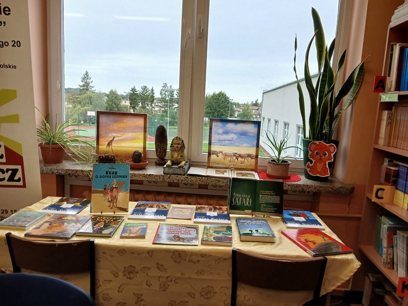 We wrześniu przygotowaliśmy gazetkę ścienną oraz wystawę w bibliotece pt. „Afryka-Safari z książką”. Na gazetce zamieściliśmy najważniejsze informacje oraz ciekawostki o tym kontynencie. Na wystawie zagościły książki o Afryce, obrazy, maski afrykańskie, figurki zwierząt. Ogłosiliśmy konkurs o zwierzętach Afryki - prace wykonane dowolną techniką uczniowie dostarczyli do biblioteki. Wkrótce rozstrzygnięcie konkursu!
